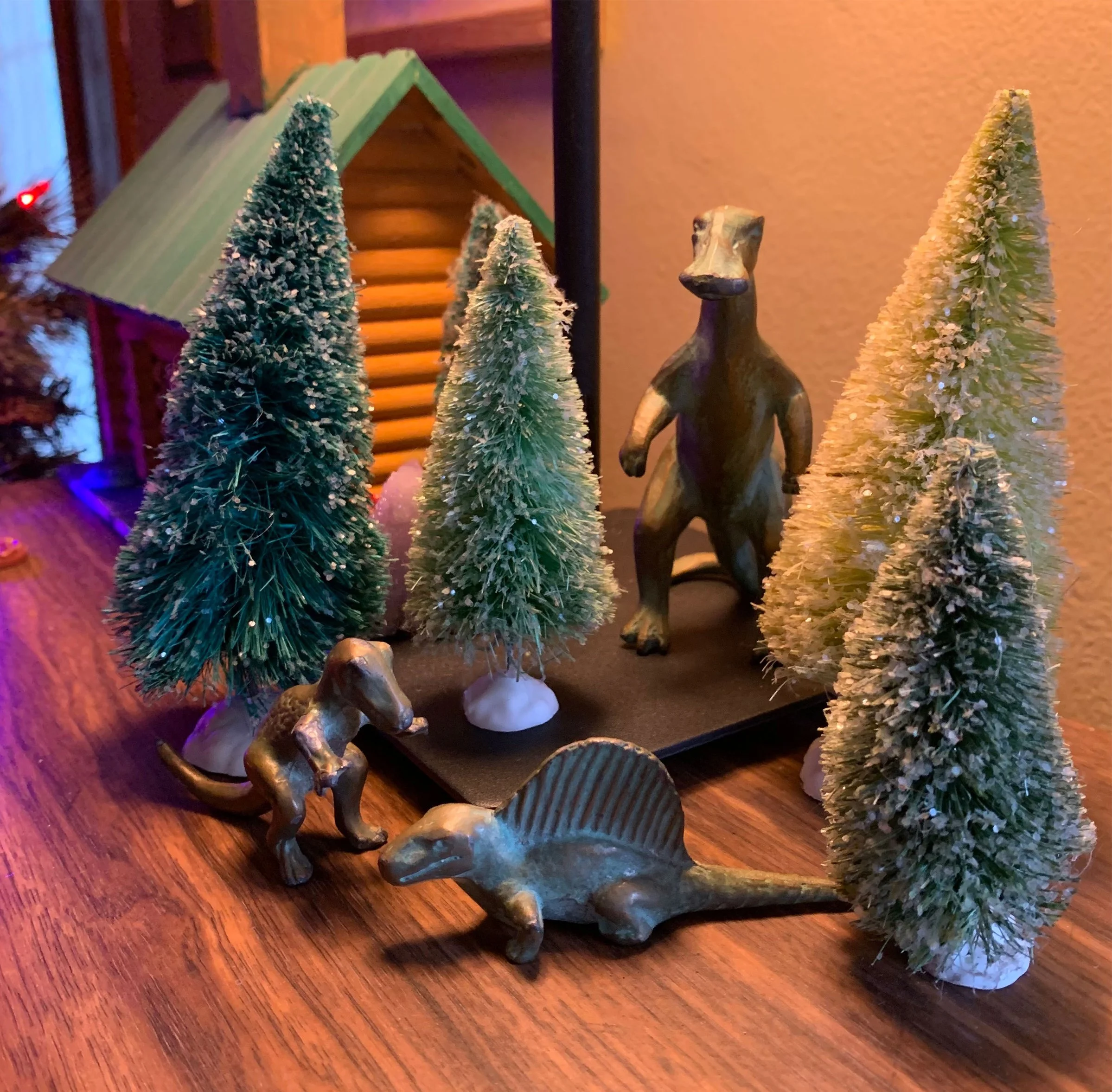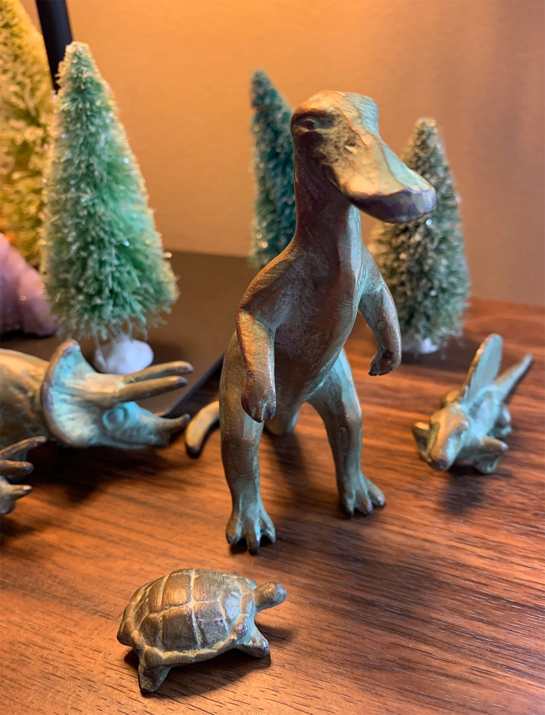 The box was filled to the brim with small tissue paper bundles. As I carefully unwrapped them, each item was an absolute delight! I found many dinosaurs, marine reptiles, a pterosaur, a mammoth, Dimetrodon, and (inexplicably) one little turtle. All are cast in metal with a brass-like finish and soft green patina.